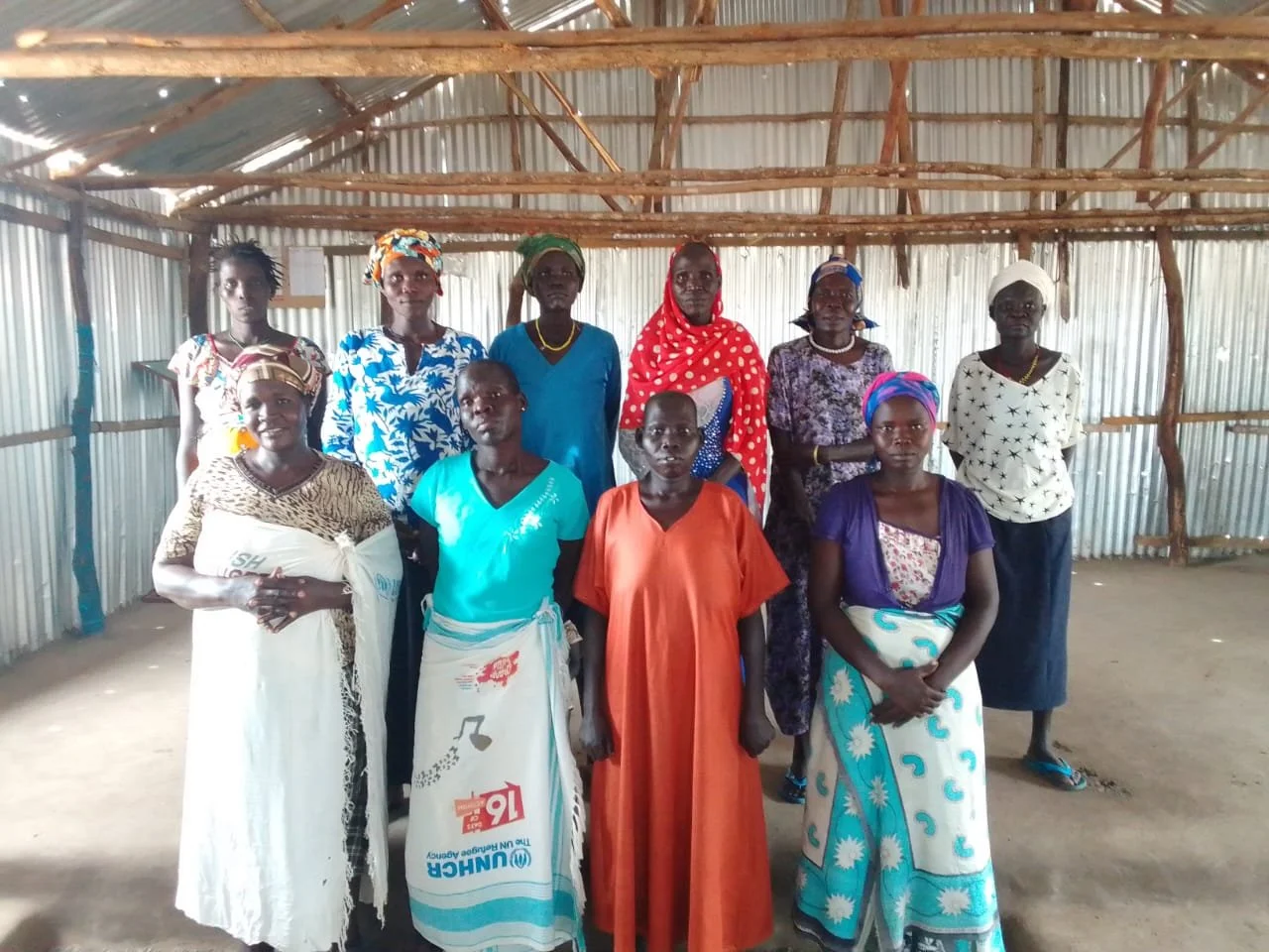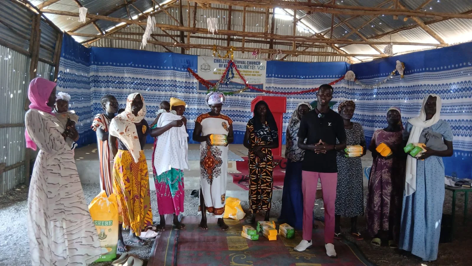 Widows from Christian Revival Church in Kalobeyei Refugee Settlement pose with Pastor Agavito after receiving distribution.